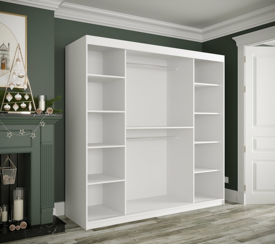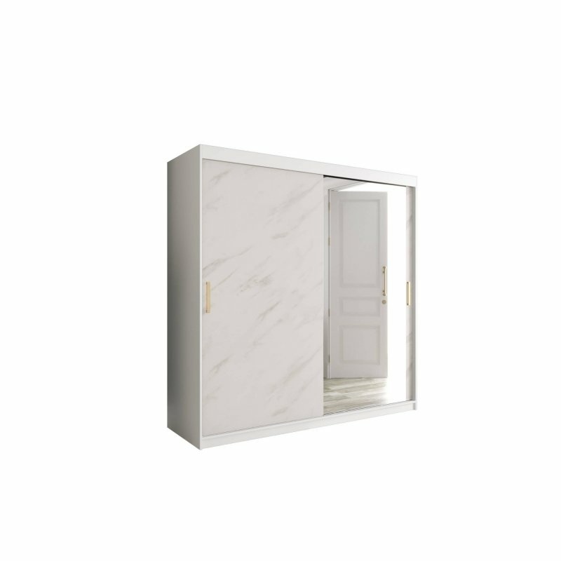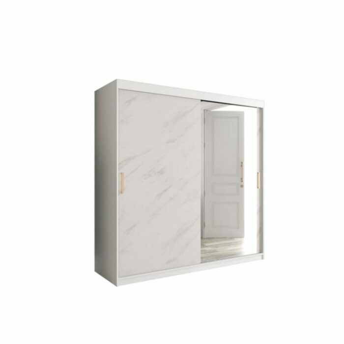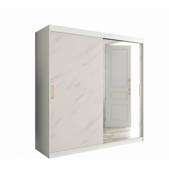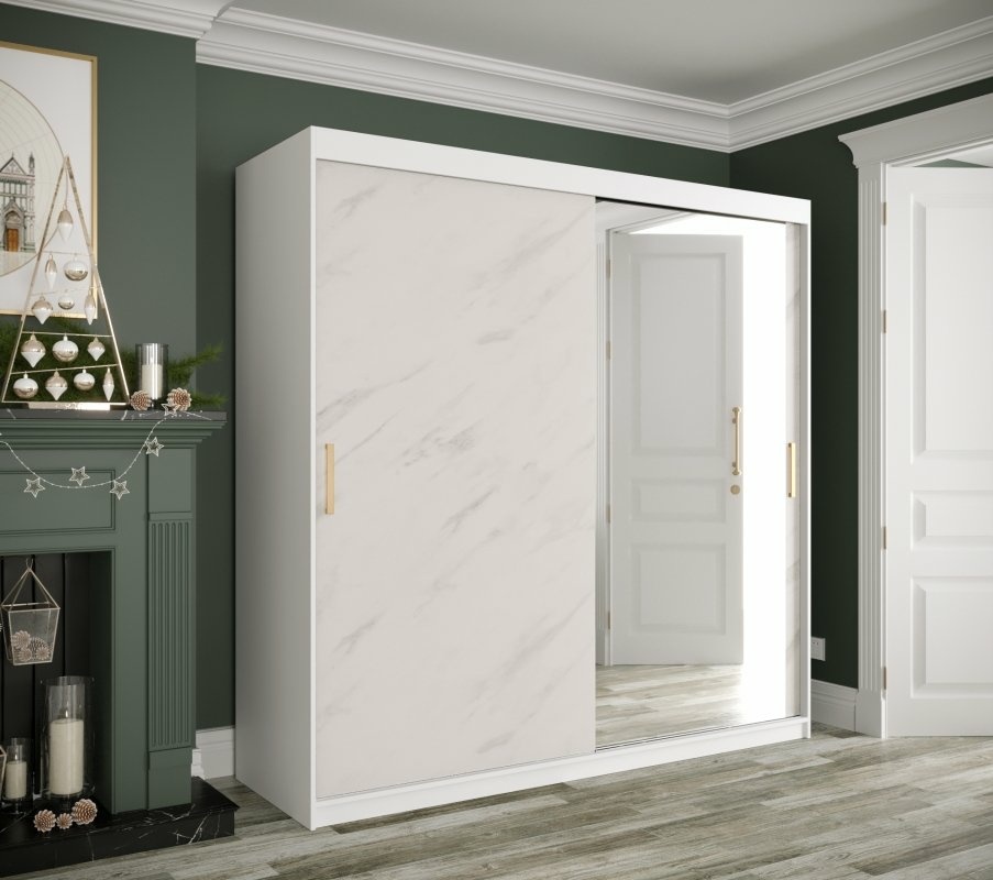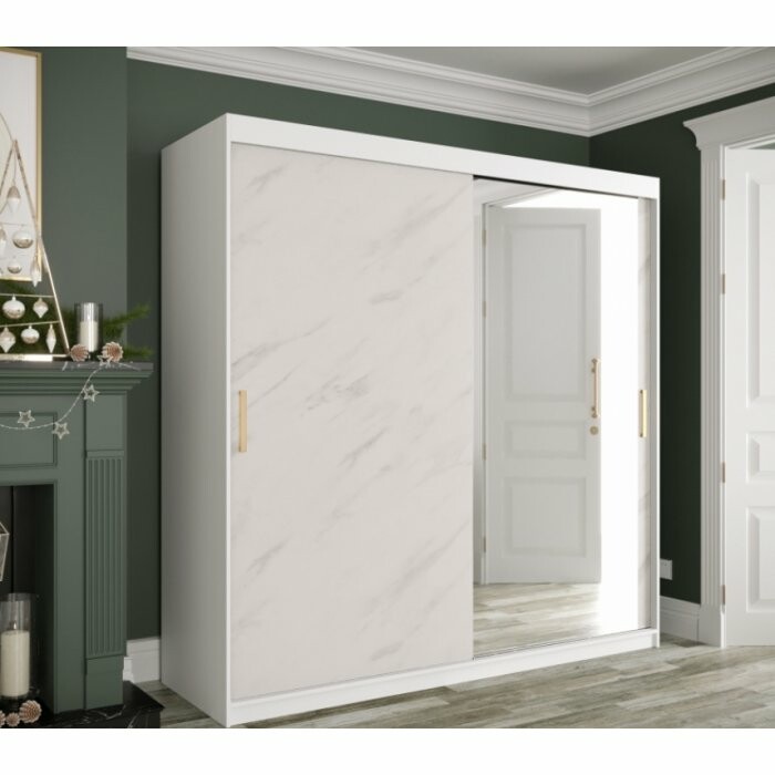 Travero Mix 200 to bardzo pojemna szafa przesuwna, idealna do większych sypialni i garderób. Jeden front w dekorze marmuru oraz drugi z lustrem wkomponowanym w jego powierzchnię tworzą nowoczesne, eleganckie połączenie, które podkreśla charakter wnętrza i optycznie powiększa przestrzeń.