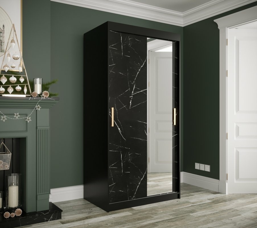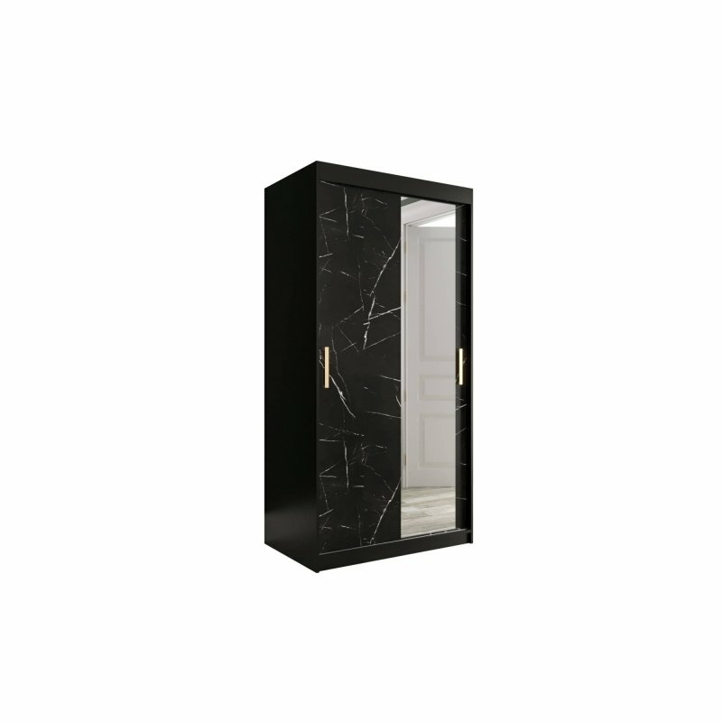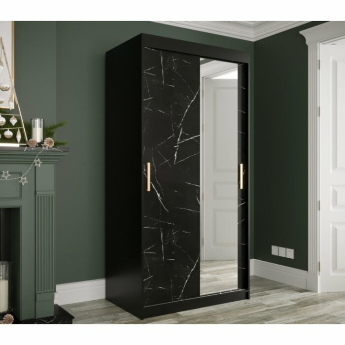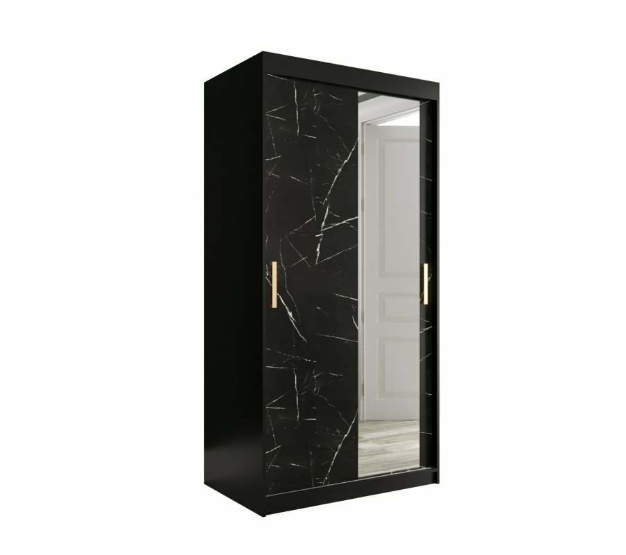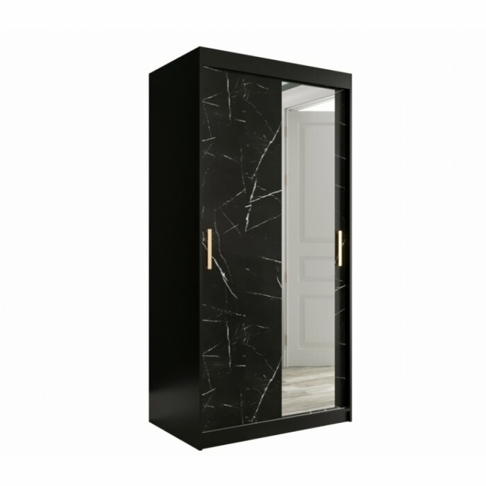 Travero Mix 100 w wersji czarny mat to kompaktowa i elegancka szafa przesuwna, która łączy front w dekorze czarnego marmuru z drugim frontem posiadającym lustro wkomponowane w jego powierzchnię. Takie połączenie nadaje meblowi nowoczesny charakter, a lustro subtelnie powiększa przestrzeń i dodaje wnętrzu głębi.