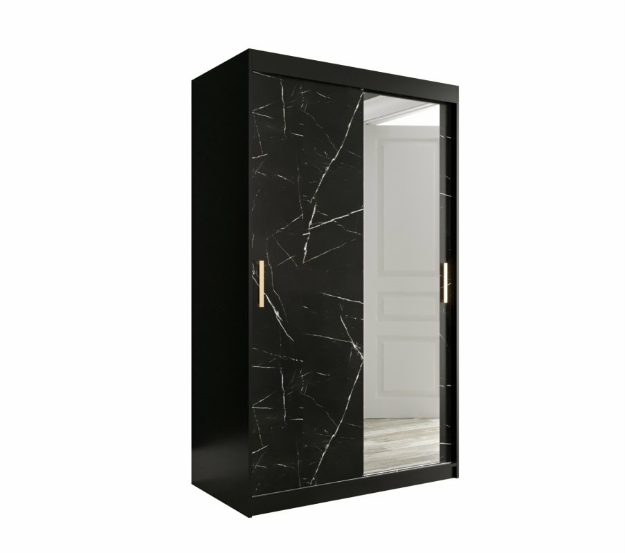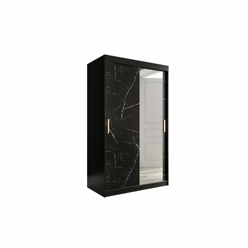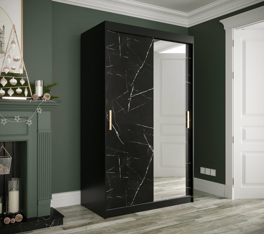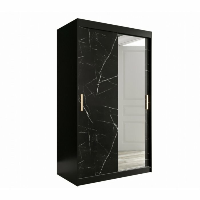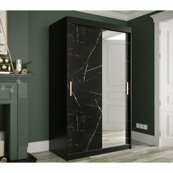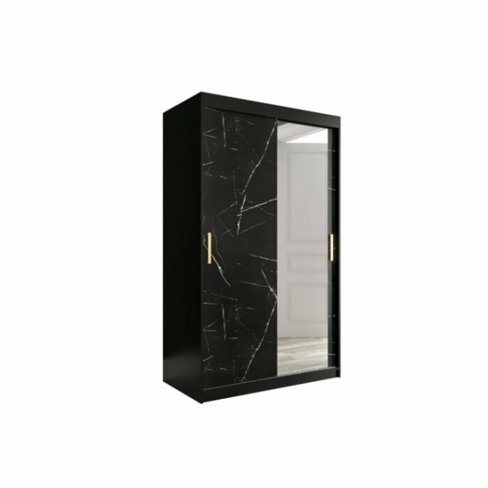 Travero Mix 120 to elegancka i nowoczesna szafa przesuwna, która łączy front w dekorze czarnego marmuru z drugim frontem posiadającym lustro wkomponowane w jego powierzchnię. Taki projekt nadaje całości lekkości, a lustro nie tylko zdobi, ale również optycznie powiększa przestrzeń.