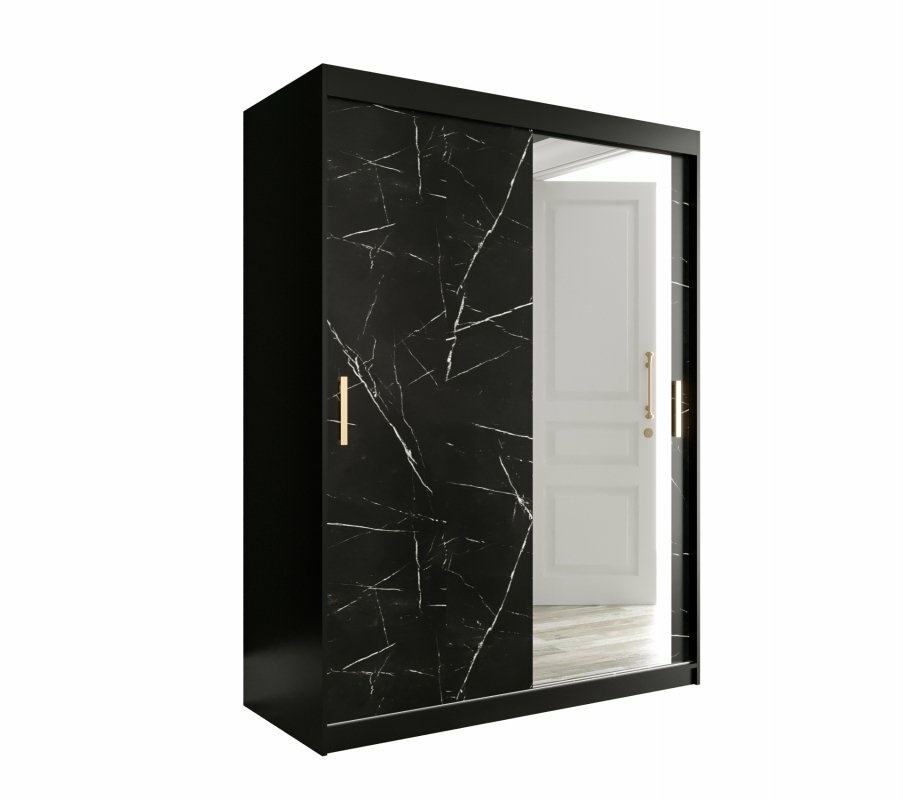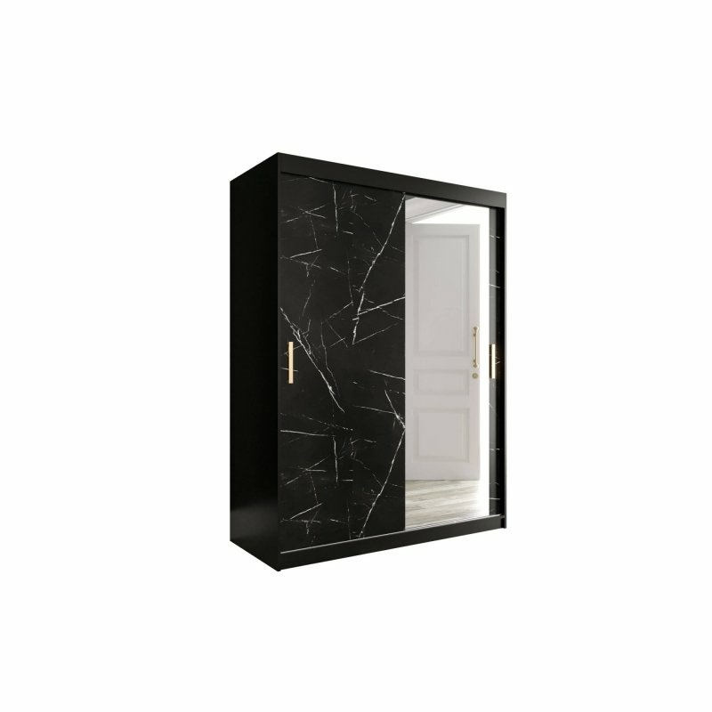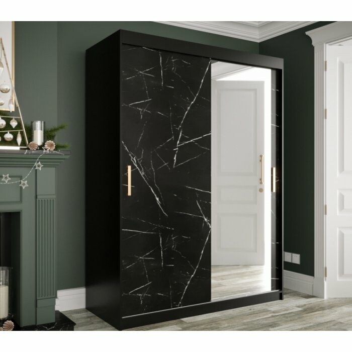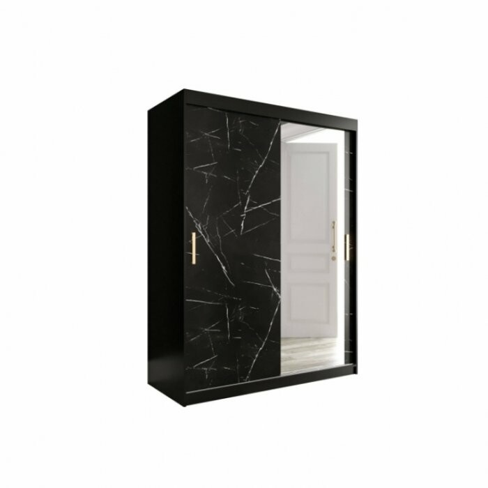 Travero Mix 150 to pojemna i stylowa szafa przesuwna, w której jeden front wykończono w dekorze czarnego marmuru, a drugi posiada lustro wkomponowane w jego powierzchnię. Dzięki temu mebel łączy nowoczesny wygląd z praktycznym zastosowaniem – lustro nie tylko dekoruje, ale też optycznie powiększa pomieszczenie.