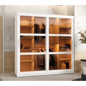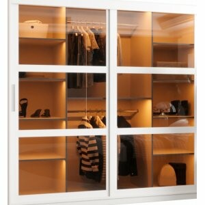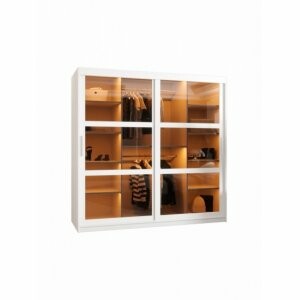 Elegancka i przesuwna szafa Viton 180 w kolorze białym matowym to propozycja dla osób, które potrzebują naprawdę dużo miejsca na przechowywanie. Szerokie przeszklone fronty w ramie MDF dodają wnętrzu lekkości i stylu, a solidny system przesuwny BIMAK gwarantuje ciche i płynne przesuwanie drzwi.