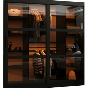 Elegancka i przesuwna szafa Viton 180 w kolorze czarnym matowym to doskonały wybór dla osób, które potrzebują sporo miejsca na przechowywanie, a jednocześnie cenią nowoczesny, elegancki design. Trzy szerokie fronty w ramie MDF z przydymionym szkłem nadają wnętrzu wyjątkowego charakteru, a system przesuwny BIMAK zapewnia ciche i lekkie przesuwanie drzwi.