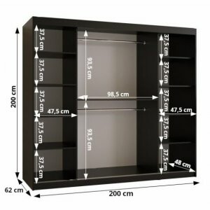 Szafa Viton 200 czarny mat to pojemny, nowoczesny mebel, który zapewnia maksymalny komfort przechowywania dzięki aż 10 półkom i przemyślanemu układowi wnętrza. Idealnie sprawdzi się w dużych sypialniach i garderobach, oferując mnóstwo miejsca na ubrania i dodatki.