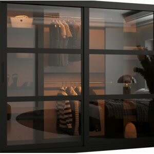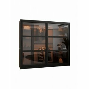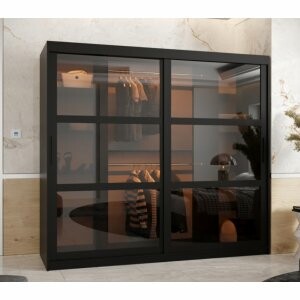 Duża, przesuwna szafa Viton 200 w kolorze czarnym matowym to doskonała propozycja dla osób, które potrzebują naprawdę dużej przestrzeni do przechowywania. Trzy przeszklone fronty w ramie MDF prezentują się bardzo elegancko, a system przesuwny BIMAK zapewnia płynne i ciche przesuwanie drzwi.