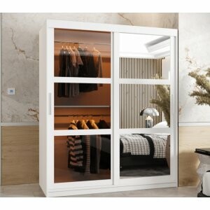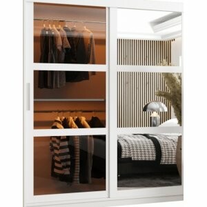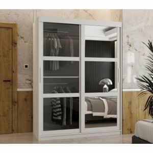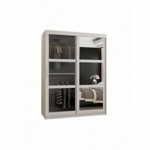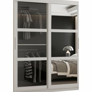 Nowoczesna i przesuwna szafa Viton Mix 150 w kolorze białym matowym to idealne rozwiązanie dla osób, które szukają eleganckiego mebla z dużą przestrzenią do przechowywania. Wyjątkowy design łączy jeden front z przydymionym szkłem i drugi z lustrem w podzielonym ramiaku MDF, dzięki czemu szafa jest zarówno praktyczna, jak i efektowna. Lustro optycznie powiększa wnętrze, a szklany front nadaje mu lekkości.