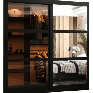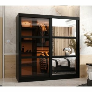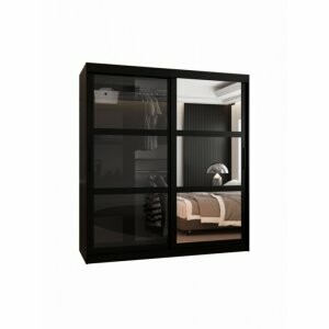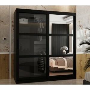 Przestronna i przesuwna szafa Viton Mix 180 w kolorze czarnym matowym to elegancki i funkcjonalny mebel, który idealnie sprawdzi się w większych pomieszczeniach. Jej unikalny wygląd tworzy połączenie jednego frontu z przydymionym szkłem i drugiego z lustrem w podzielonym ramiaku MDF, co nadaje całości wyrazistego, nowoczesnego charakteru. Lustro optycznie powiększa przestrzeń, a szklany front dodaje lekkości i głębi.