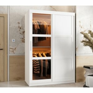 Stylowa i przesuwna szafa Viton Solid 120 w kolorze białym matowym to nowoczesny mebel, który świetnie sprawdzi się w sypialni, garderobie czy przedpokoju. Jej charakterystyczny design tworzy połączenie jednego frontu z przydymionym szkłem i drugiego z płyty w ramie MDF, podzielonego na pola, co zapewnia spójny, elegancki wygląd.