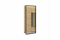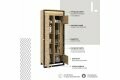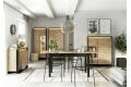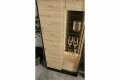 Wysoka witryna w nowoczesnym, loftowym stylu. Smukła, czarna podpora oraz ciekawy dekor podkreślają nowoczesny styl mebla. Funkcjonalny podział wnętrza pozwala niektóre przedmioty schować, a inne ciekawie wyeksponować. W lewej części mebla znajdziesz zamykany regał z półkami. Prawa strona została podzielona na strefę z przeszkleniem oraz część z dwoma szafkami. Witryna posiada dwa rodzaje oświetlenia ledowego – zewnętrzne podkreślające przestrzenny charakter frontów (dostępne w komplecie) oraz wewnętrze, umieszczone w części przeszklonej (dostępne w opcji dodatkowej).